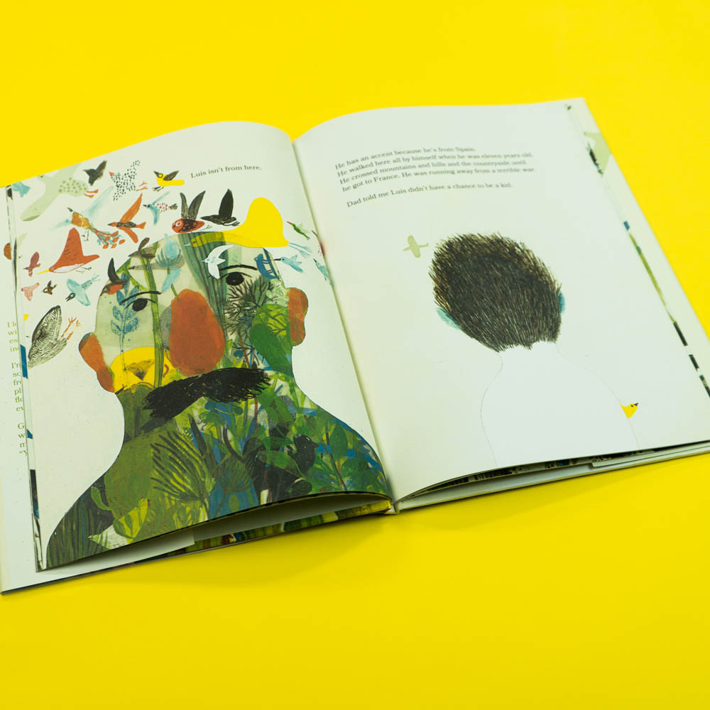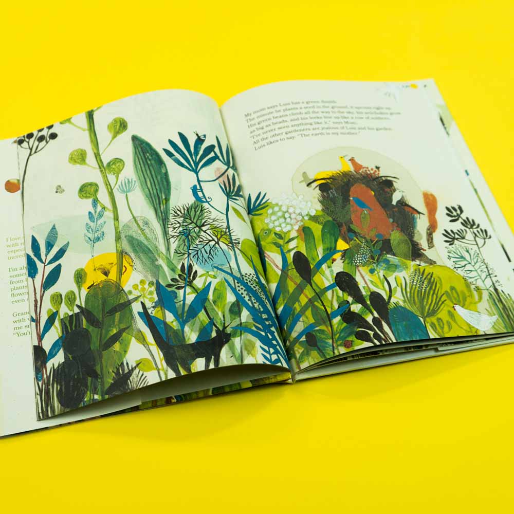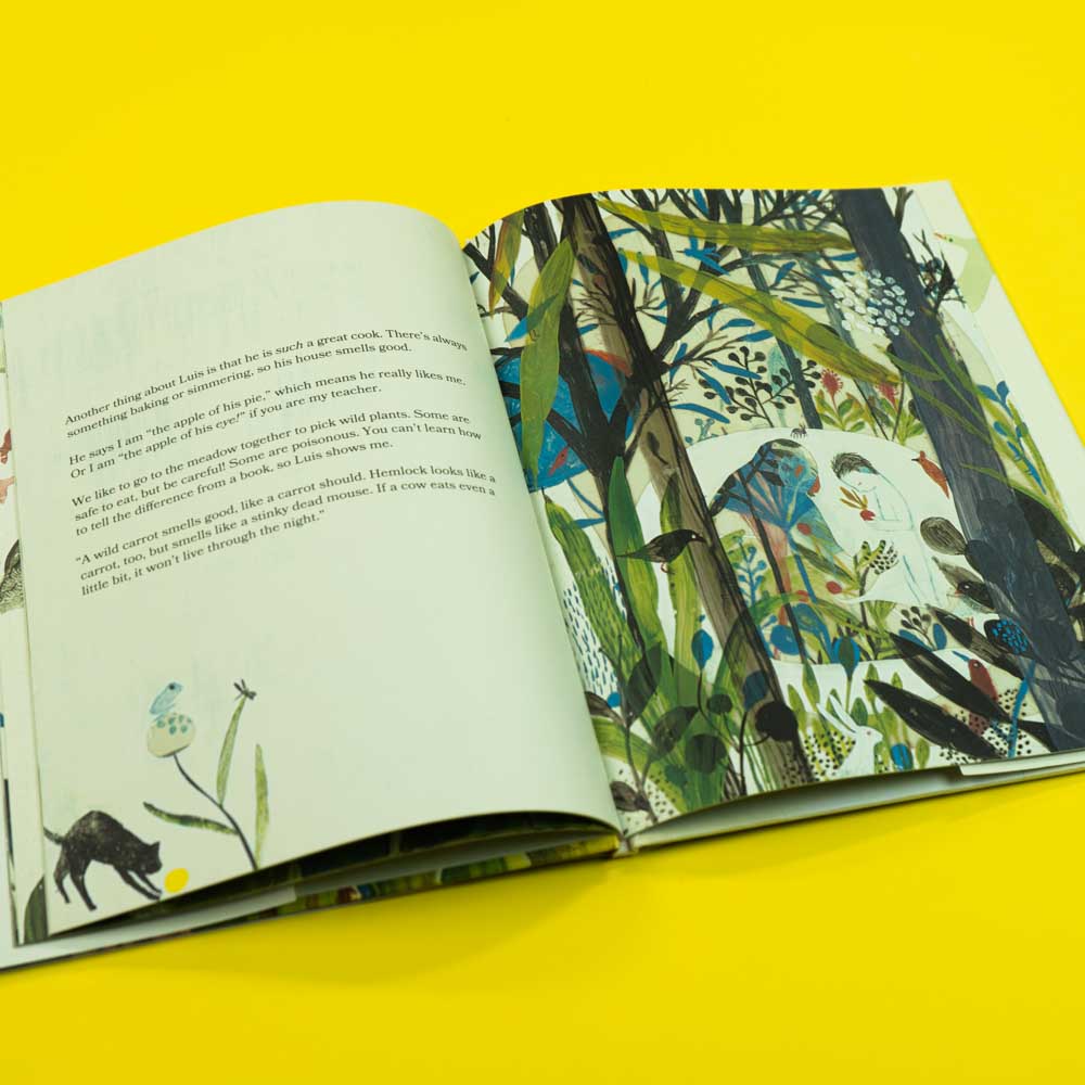 At six years old, the child-narrator of this picture book loves nothing more than spending time with his grandpa, Luis—especially in his marvelous garden, where green beans reach as high as the sky. Luis’s garden is where the little boy practices reading and writing. But just as importantly, it’s also where he learns wonderful things from Luis, like the names of all the birds in the trees and new expressions that are so much fun to say. Luis’s playful vocabulary is as vibrant and full of life as his garden, and phrases that are particular to his way of talking, like “at the drop of a cat” (which means right away), are soon adapted into the little boy’s lexicon, too.