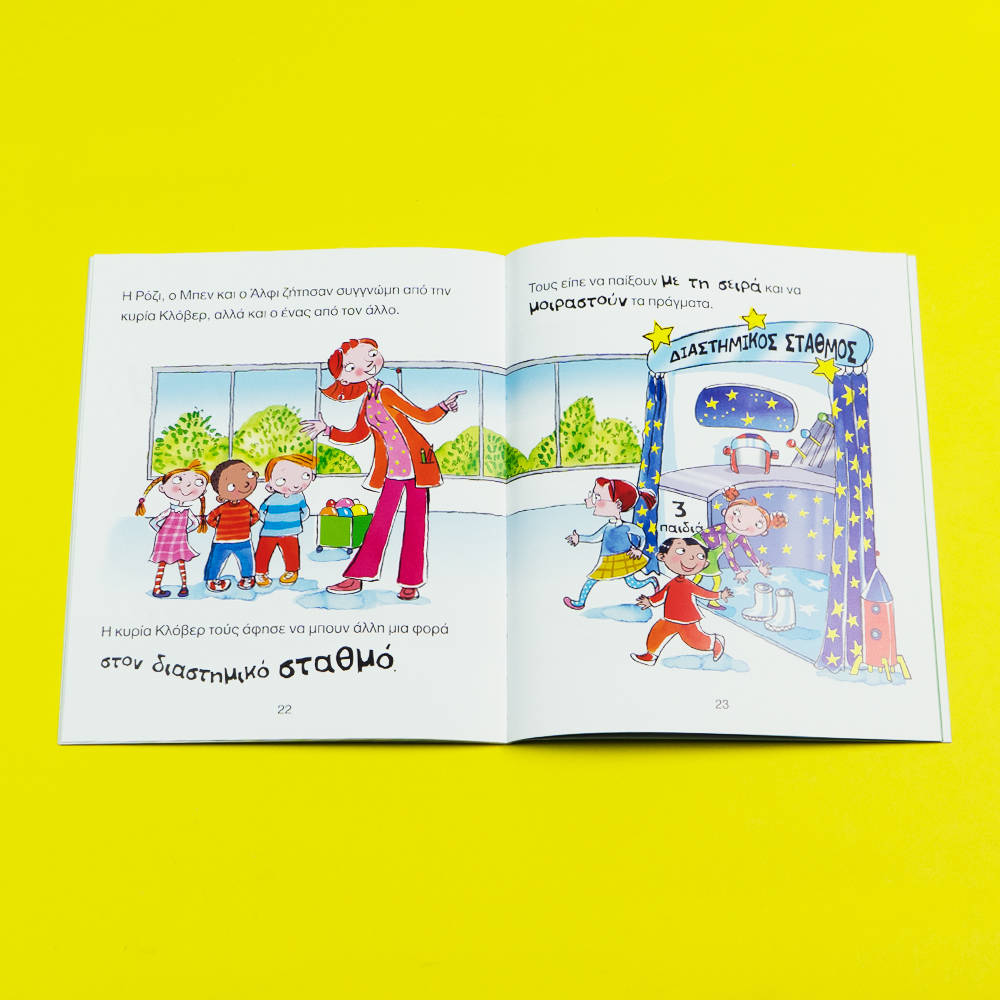 Η κυρία Κλόβερ έχει φτιάξει έναν διαστηµικό σταθµό. Η Ρόζι, ο Μπεν και ο Άλφι πρέπει να τον µοιραστούν και να παίξουν µε τη σειρά. Η Ρόζι όµως τον θέλει όλο δικό της και οι υπόλοιποι θυµώνουν µαζί της! Θα µπορέσουν τα παιδιά να µάθουν να µοιράζονται, ώστε να διασκεδάσουν όλοι;