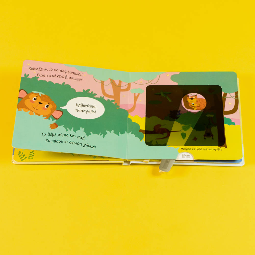 Το παιδί βάζει τον «μαγικό» φακό ανάμεσα στις σελίδες και «φωτίζει» τις εικόνες για να βρει όλα τα ζωάκια.