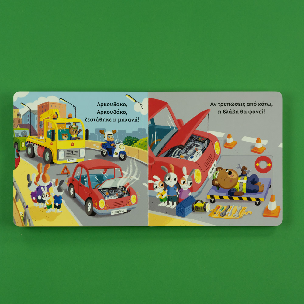 Σήμερα χάλασε το αυτοκίνητο της οικογένειας των κουνελιών και πρέπει να καλέσουν την οδική βοήθεια! Ο Αρκουδάκος είναι έτοιμος να βοηθήσει! Ένα βιβλιαράκι με υπέροχες εικόνες και έξυπνα κινούμενα μέρη.