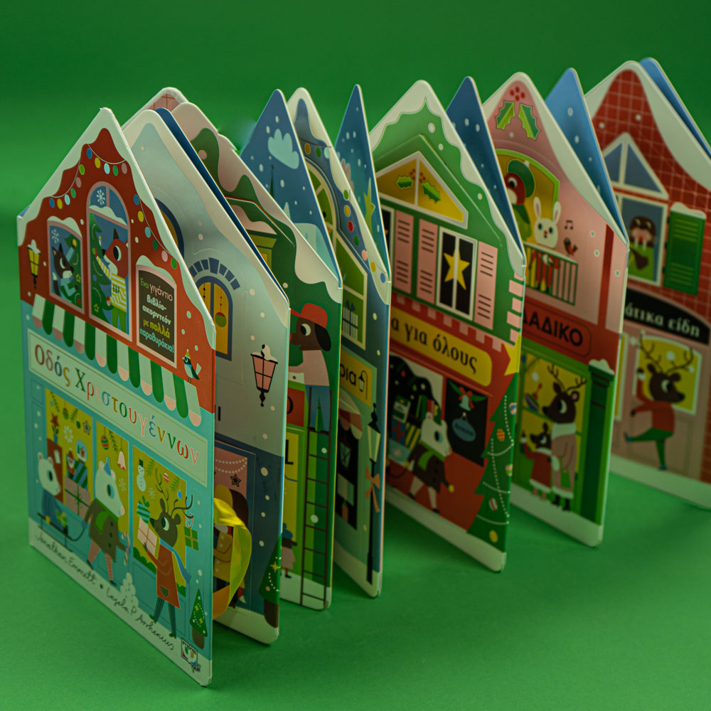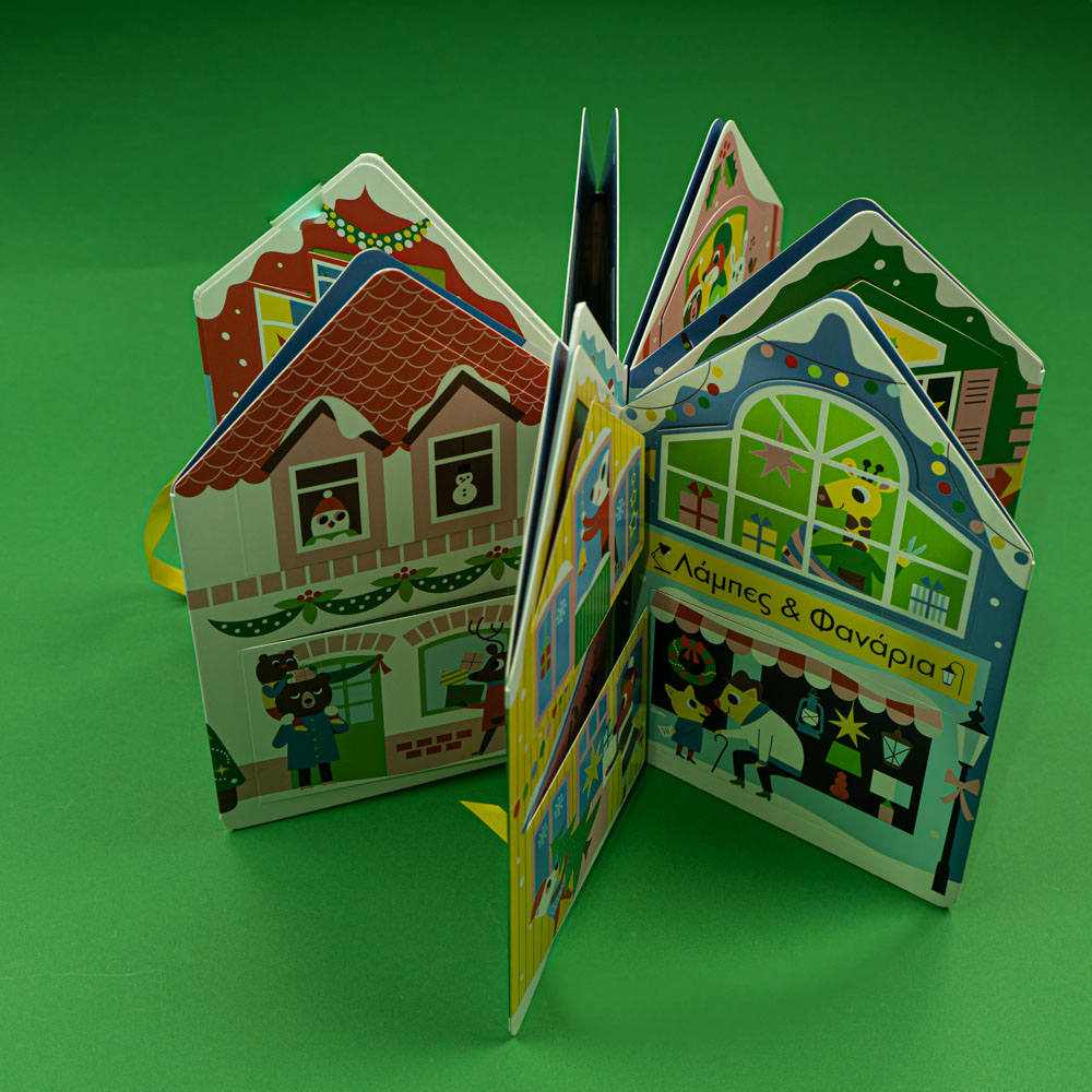 Αυτό το εντυπωσιακό βιβλίο-ακορντεόν διπλής όψης θα ενθουσιάσει τα παιδιά! Η ιστορία ξεδιπλώνεται έμμετρα μέσα από διασκεδαστικά παραθυράκια, πάνω σ’ ένα υπέροχο γιορτινό σκηνικό, που θα στολίζει όμορφα το δωμάτιό τους ή το χριστουγεννιάτικο δέντρο!
